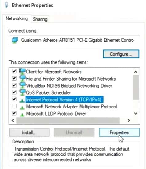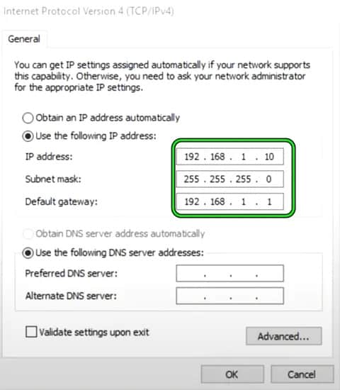 - Luego haz doble clic en Protocolo de Internet versión 4 (TCP / IP) e ingresa la siguiente información en los cuadros correspondientes: