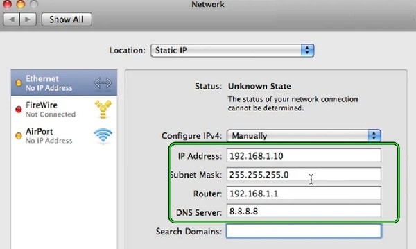 - Luego, selecciona la conexión ethernet del sistema e ingresa la IP del enrutador en el campo Archivo de host, por lo general, lo siguiente: