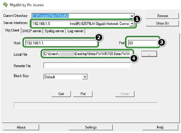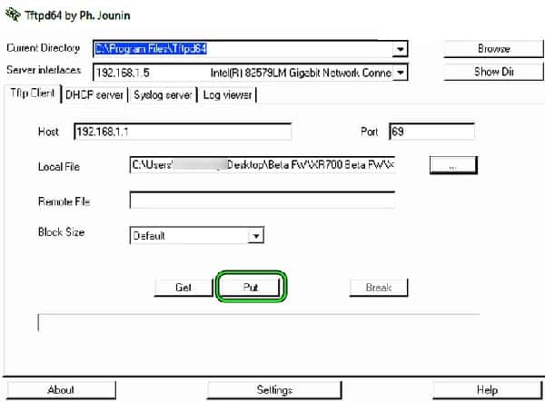 - Para continuar, ve al siguiente paso sin hacer clic en Poner (o cualquier otro botón) en el cliente TFTP.