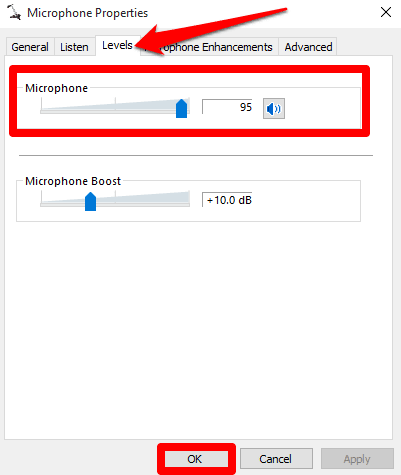 Con los controladores de la tarjeta de audio y sonido actualizados, reinicie su PC y verifique los niveles de volumen del micrófono. Si el problema es con su micrófono, nuestra guía sobre cómo arreglar un micrófono que no funciona en Windows 10( how to fix a microphone not working in Windows 10) tiene más soluciones que puede probar.
