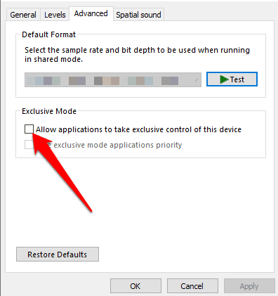 Nota(Note) : también puede ir a Propiedades del (Properties )micrófono(Microphone) > pestaña Avanzado( Advanced) y desmarcar la opción Permitir que la aplicación tome el control ejecutivo de este dispositivo(Allow application to take executive control of this device) en caso de que aumentar el nivel de volumen no ayude.