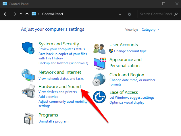 - Para ello, abra Panel(Control Panel ) de control > Hardware y sonido( Hardware and Sound) .