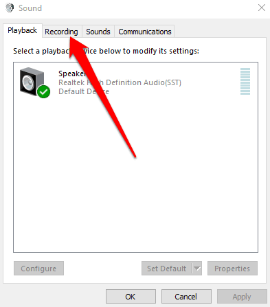 - En la ventana emergente Sonido(Sound) que aparece, seleccione la pestaña Grabación .(Recording)