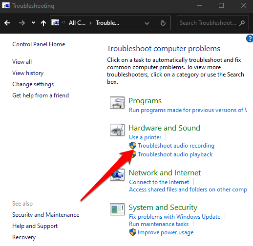- Seleccione Solucionar problemas de grabación de audio(Troubleshoot audio recording) en Hardware y sonido(Hardware and Sound) y luego verifique si su opción de refuerzo de micrófono está disponible.