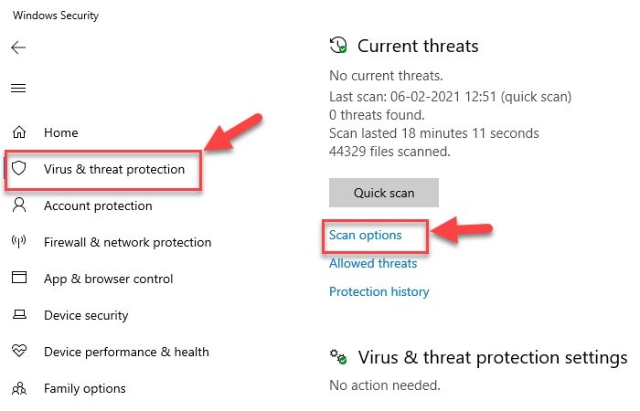 Paso 4:(Step 4:) Haga clic en Protección contra virus & threat Protection(left panel)> Scan options(righ panel).