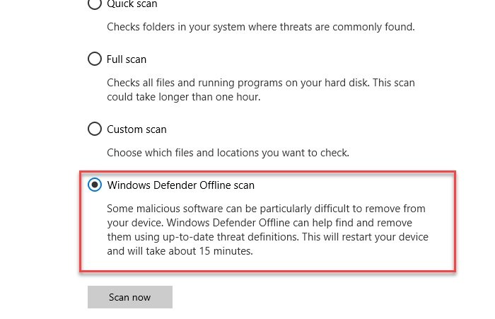 Paso 5:(Step 5: ) seleccione Windows Defender Offline scan> Scan now