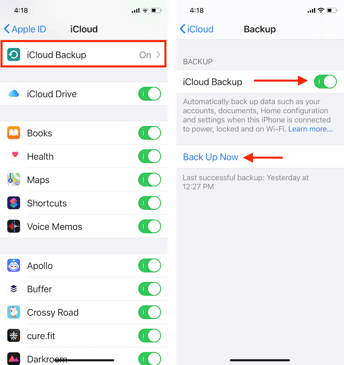 Mientras esté en la aplicación Configuración(Settings) , también debe habilitar la función Copias de seguridad de iCloud(iCloud Backups feature) . Esto hará una copia de seguridad periódica de los datos importantes de su iPhone y iPad (incluidos contactos, mensajes y datos de aplicaciones).
