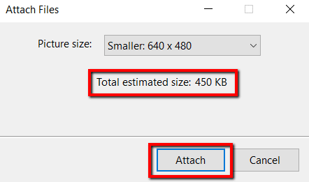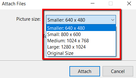 Aparecerá una ventana Adjuntar archivos. (Adjuntar archivos)Aquí puede especificar tamaño de la imagen(Tamaño de foto) usted quiere. Tus opciones son El más pequeño, pequeño, mediano(Pequeño, Pequeño, Mediano,) Sí Excelente(Largo) .
