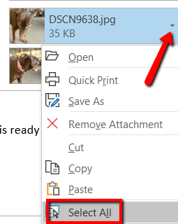 haga clic aquí(Hacer clic) en la flecha de cualquiera de estos archivos adjuntos. Esto abrirá un menú desplegable. En ella elige Seleccionar todo(Seleccionar todo) .