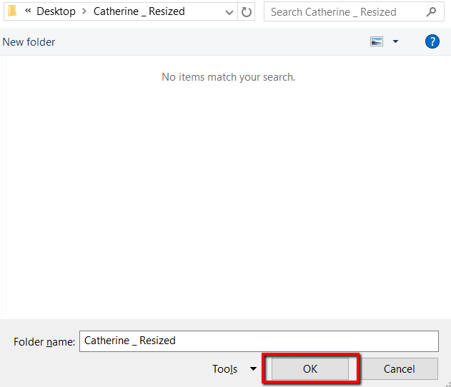 Elija dónde desea guardar estas fotos redimensionadas. Luego haga clic Aceptar(ESTÁ BIEN) .