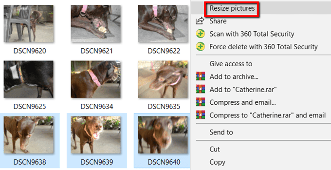 Elige tus fotos. Luego haga clic derecho sobre ellos y seleccione Cambiar el tamaño de las imágenes(Redimensionar fotos) opciones