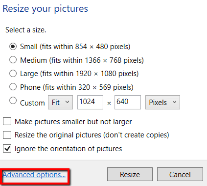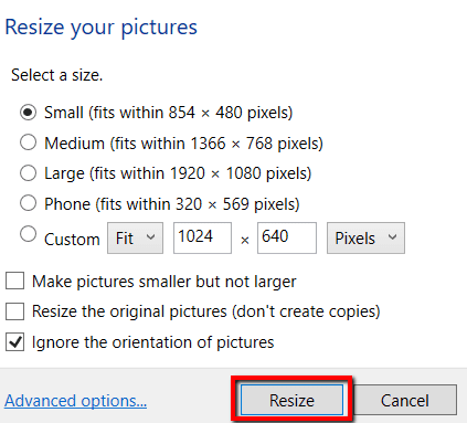 Tambien tu puedes reducir las imágenes, pero no más grandes, cambiar el tamaño de las imágenes originales(Hacer fotos más pequeñas pero no más grandes, cambiar el tamaño de las fotos originales) y ignorar la orientación de la imagen(Ignorar la orientación de la foto) . Sólo(Sólo) seleccione las opciones que desee y presione Redimensionar cuando haya terminado.