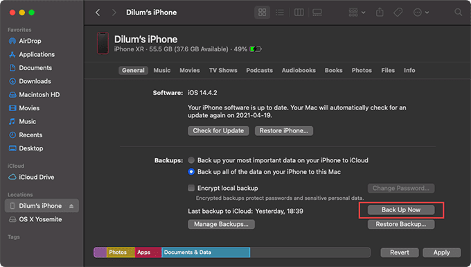 2. Seleccione la opción Copia de seguridad todos los datos de iPhone en esta Mac(Copia de seguridad de todos los datos del iPhone en esta Mac) y elige copia ahora(Copia ahora) para crear una nueva copia de seguridad local. Puede crear una copia de seguridad encriptada si desea que contenga información confidencial, como datos de salud, contraseñas guardadas y configuraciones de Wi-Fi.