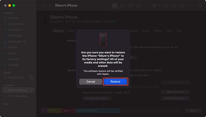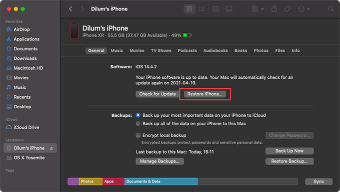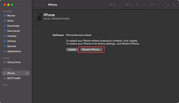 Si desactivaste Buscar mi iPhone en tu iPhone(Buscar mi iPhone está desactivado en el iPhone) En el pasado, también era posible restablecer de fábrica el dispositivo usando iTunes / Finder normalmente. Sin embargo, esto es poco probable, lo que significa que tendrá que recurrir a Modo de recuperación(Modo de recuperación) .