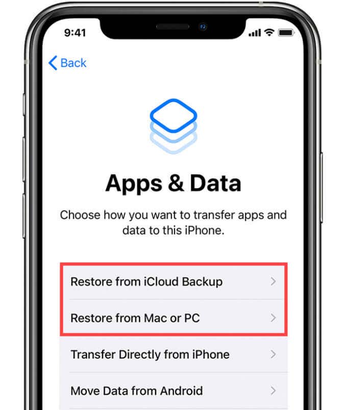 Si tiene una copia de seguridad de iTunes / Finder o iCloud, puede restaurarla en la pantalla Aplicaciones y datos. (Aplicaciones y datos)Elige una de las opciones Restaurar desde la copia de seguridad de iCloud(Restaurar desde la copia de seguridad de iCloud) ambas cosas Restaurar desde Mac o PC(Restaurar desde Mac o PC) según sea necesario.