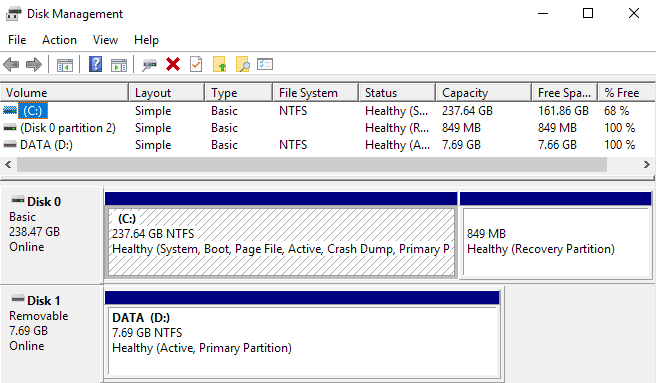 Verá una lista de volúmenes en la parte superior y discos y particiones en la parte inferior. Cualquier partición que tenga una letra de unidad aparecerá en el área blanca. Si ha conectado un dispositivo USB y puede verlo en la lista pero no hay letra de unidad, ahora puede asignarlo.
