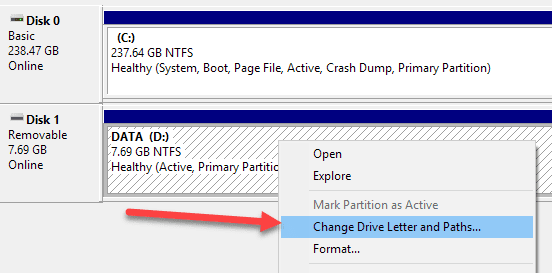 Para asignar o cambiar una letra de unidad para una unidad o partición, simplemente haga clic derecho sobre ella y seleccione Cambiar la letra de la unidad y las rutas(Cambiar la letra de la unidad y las rutas) .
