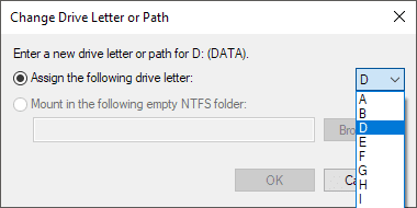 Luego seleccione una nueva letra de unidad de la lista desplegable. Puede elegir entre letras de la A a la Z.
