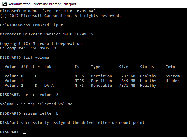 diskpart list volume select volume x assign letter=x