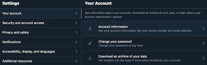 - Sigue la ruta Tu cuenta(Your account) > Información(Account information) de la cuenta . Twitter le pedirá que confirme su contraseña para continuar.