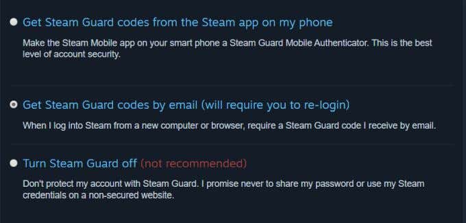 - Elige(Choose) si quieres que te envíen los códigos de Steam Guard por teléfono o correo electrónico. Esto es para la autenticación de dos factores y le permitirá mantener su cuenta segura.