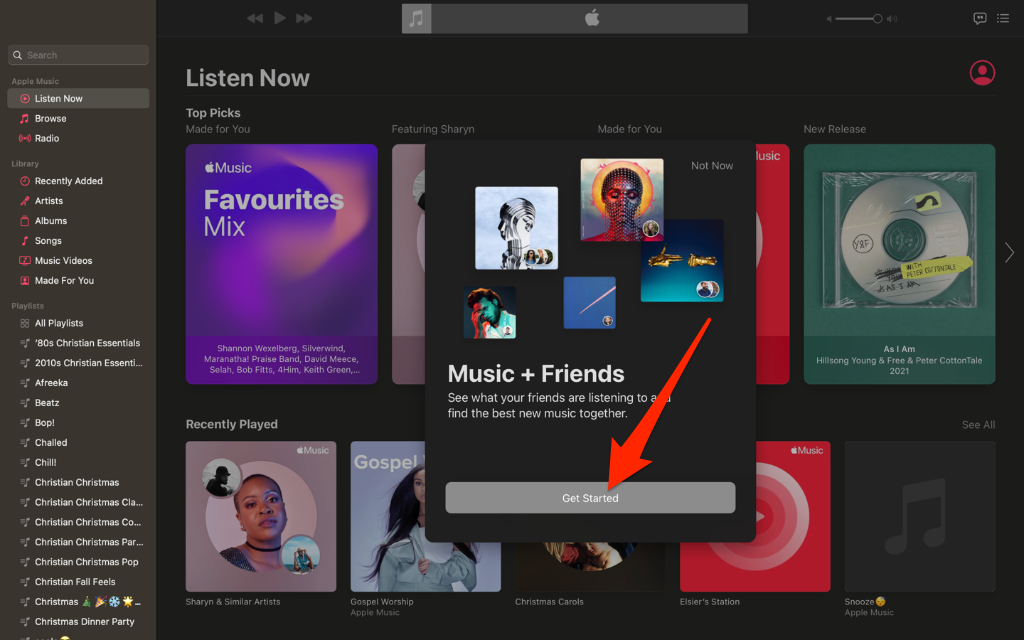 - Si es la primera vez que hace esto, la ventana emergente Music+Friends aparecerá en su pantalla. Seleccione el botón Comenzar(Get Started ) .