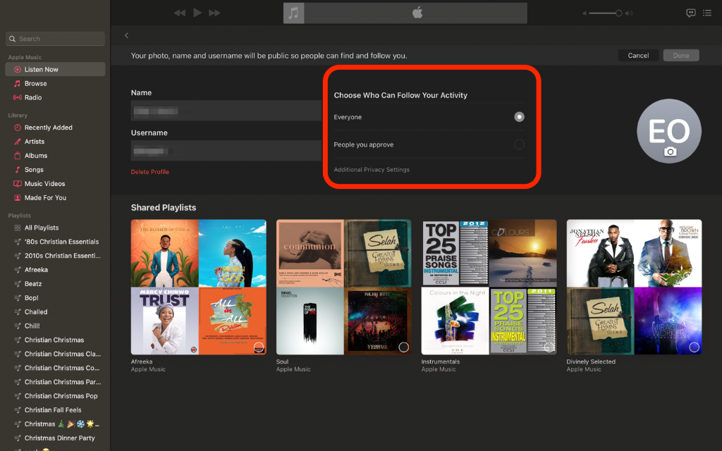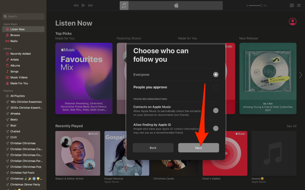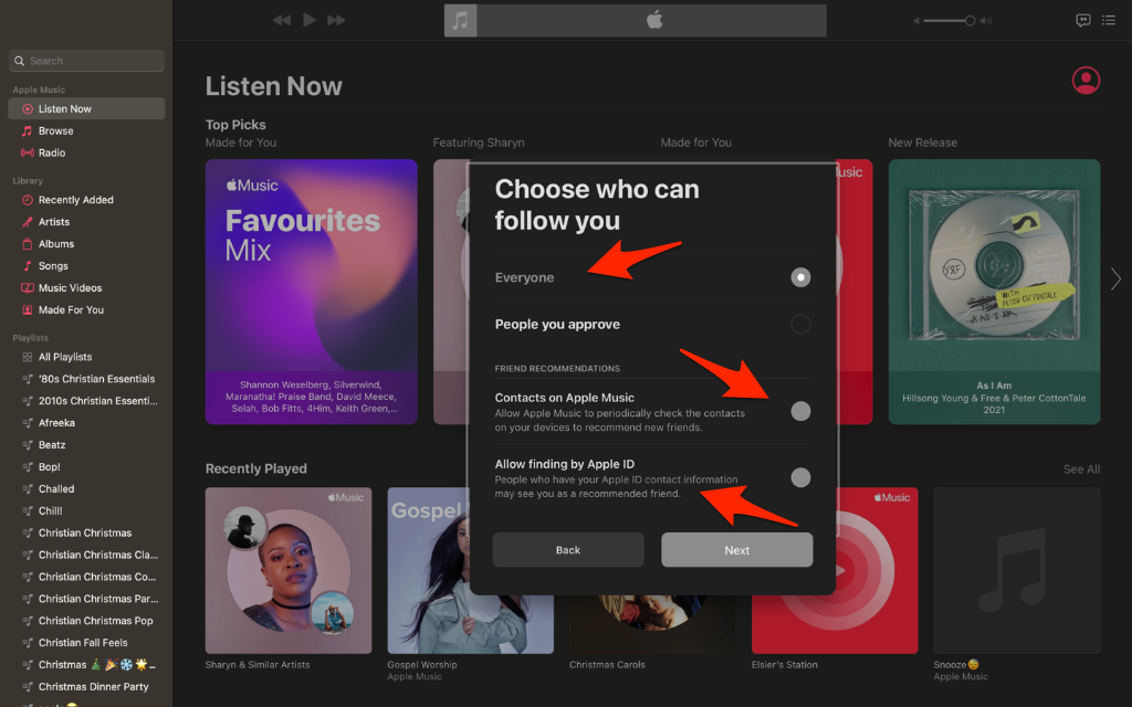 - En la ventana emergente Elige quién puede seguirte(Choose who can follow you) y selecciona una de las opciones: Todos, Personas(People) que apruebas, Permitir(Allow) encontrar por ID de Apple(Apple ID) o Contactos en Apple Music .