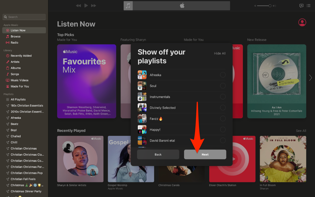 - En la ventana emergente Show off your playlists , seleccione Next .
