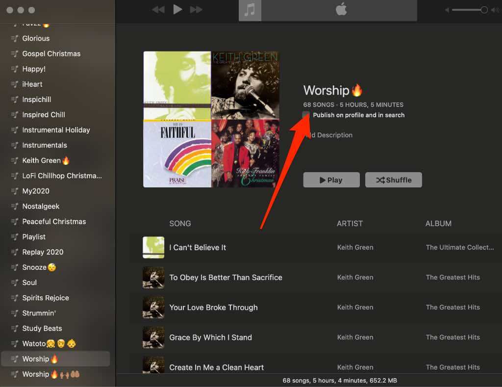 - Seleccione Publicar en el perfil y en la búsqueda(Publish on profile and in search) justo encima de la lista de canciones en la lista de reproducción.