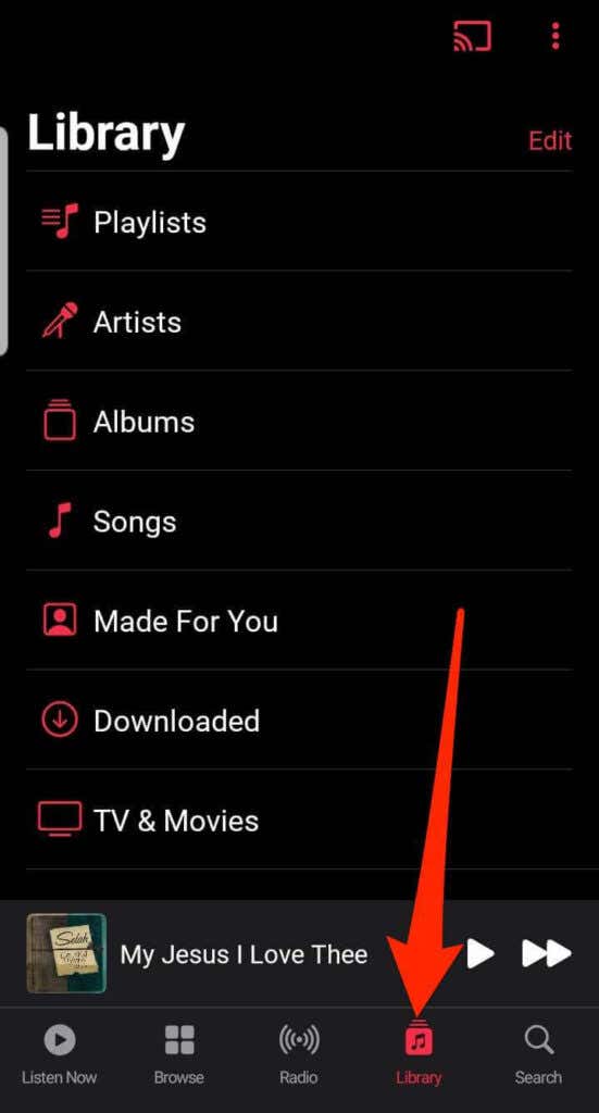 - Inicie la aplicación Apple Music en su dispositivo Android y toque Biblioteca(Library) .