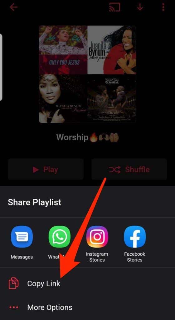 - Seleccione Copiar enlace(Copy Link) o Más opciones(More Options) para compartir el enlace a su lista de reproducción con otros usuarios a través de otras aplicaciones como Instagram , WhatsApp y más.