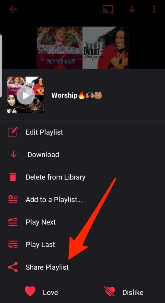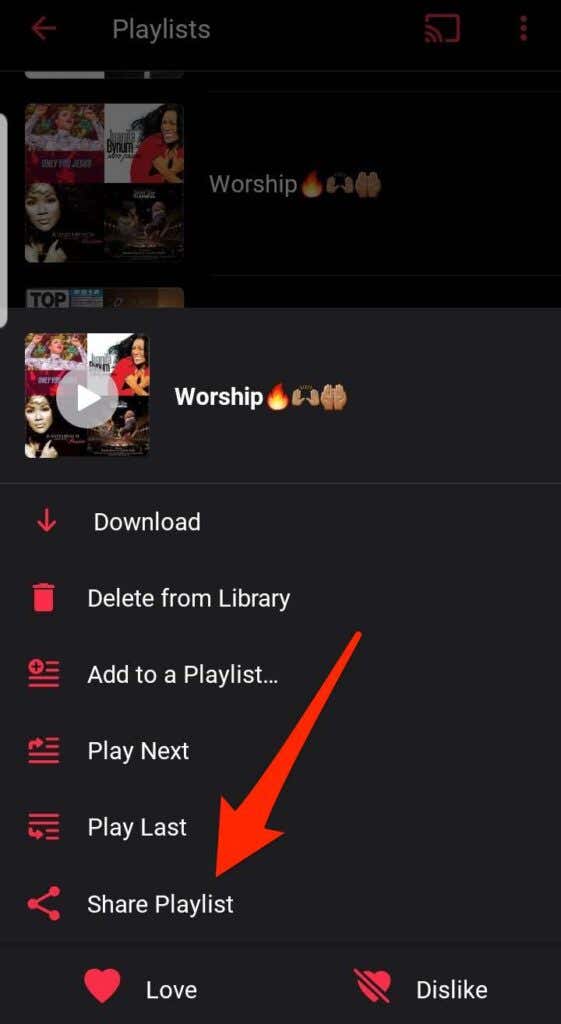 - Toque Compartir lista de reproducción(Share playlist) y luego toque Copiar enlace(Copy Link) o Más opciones(More Options) para compartir con otros.