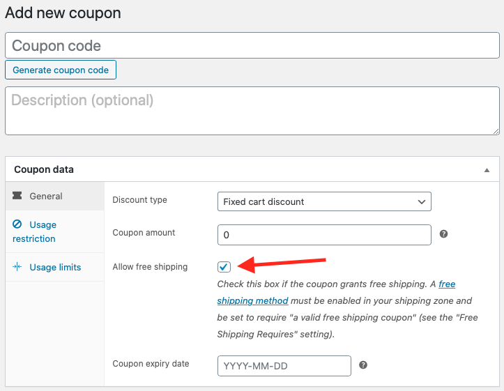 Además, puedes crear un cupón para envío gratis. En la sección «WooCommerce» de la barra lateral izquierda, haz clic en «Cupones». Al crear su cupón, marque la casilla «Permitir envío gratis».