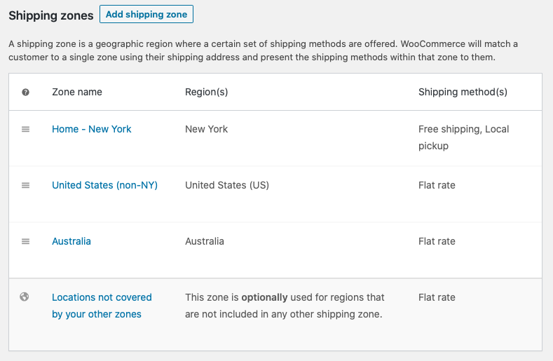 Para empezar, el envío de WooCommerce solo le ofrece dos zonas: EE. UU. y fuera de EE. UU. Sin embargo, en esta sección puede crear zonas adicionales en los EE. UU. y en el extranjero. Por ejemplo, puedes hacer algo como esto: