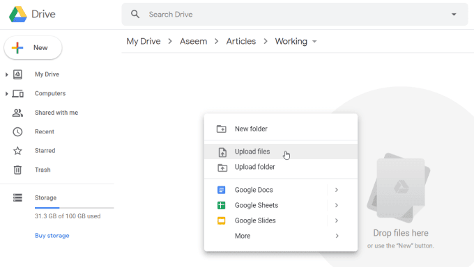 - Cargue el archivo PDF(PDF file) en su cuenta de Google Drive(Google Drive account) haciendo clic derecho dentro de cualquier carpeta y seleccionando (folder and selecting) Cargar archivos(Upload Files) .
