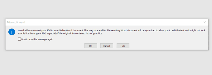 - Verá una ventana emergente que le notifica que el archivo debe convertirse del formato PDF(PDF format) . Seleccione Aceptar(OK) para continuar.