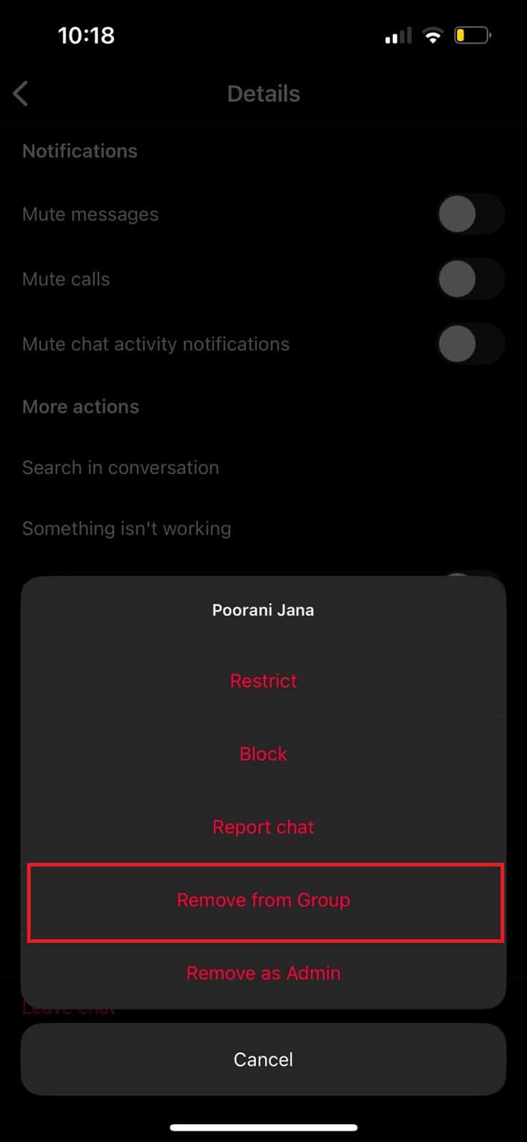 6. Nuevamente, toque en el icono de tres puntos junto al administrador eliminado y toca Sacar del grupo.