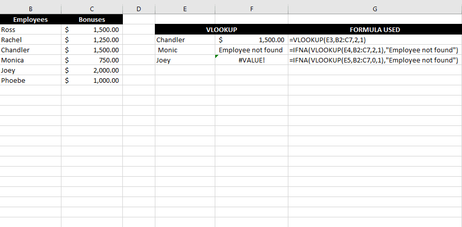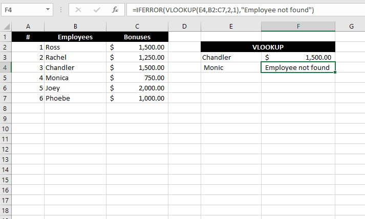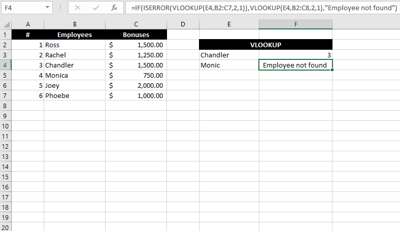 =IF(ISERROR(VLOOKUP(E4,B2:C7,2,1)),VLOOKUP(E4,B2:C8,2,1),”Employee not found”)