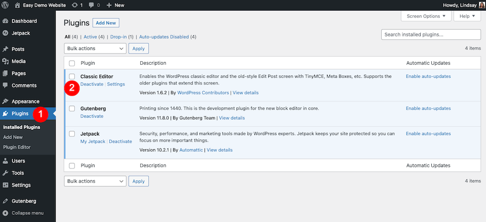 Para ver si un complemento está causando el problema, desactívelo uno a la vez, luego pruebe el sitio para ver si todavía recibe el error. Ir Complementos en la barra lateral izquierda del Tablero y luego haga clic en Desactivar bajo el nombre del enchufe. Después de desactivar cada complemento, es una buena idea cerrar sesión en WordPress, borrar el caché y reiniciar el sitio web.