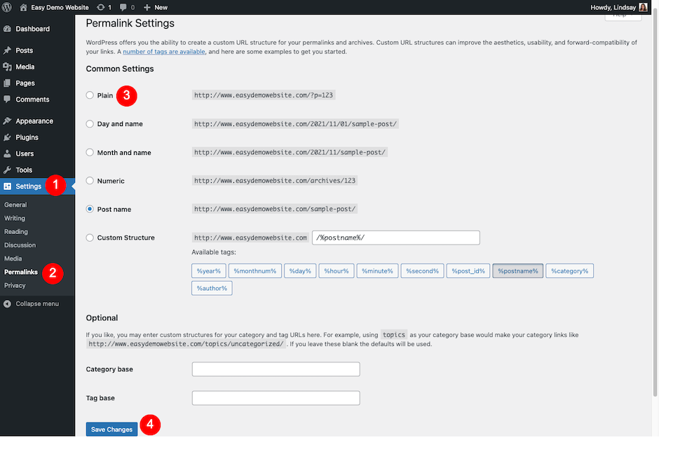 Vaya al panel de administración de WordPress y vaya a Ajustes > enlaces permanentes. Para restablecer los enlaces permanentes que crean un archivo .htaccess nuevo y sin daños, seleccione Común y haga clic guardar cambios En el fondo. Luego cambie la estructura del enlace permanente a lo que desee y haga clic en guardar cambios otra vez.