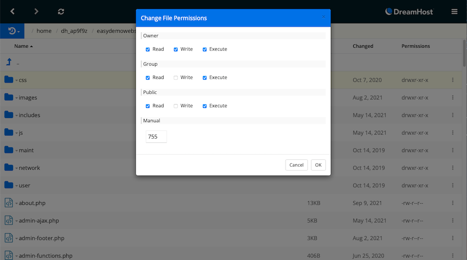 - Los directorios deben tener el número 755 (o drwxr-xr-x) o 750
