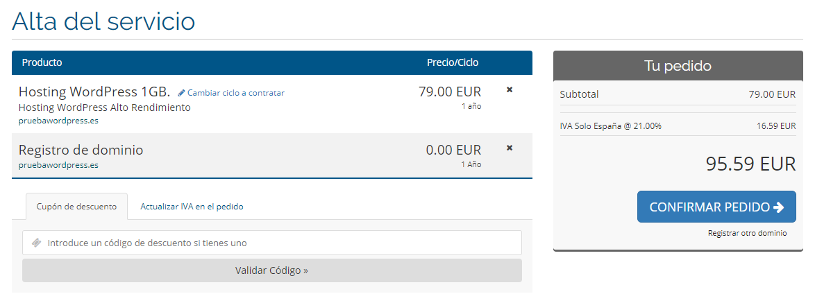 Si has llegado hasta aquí ya casi tienes tu blog WordPress! Ahora solo te queda completar el proceso abonando el pago anual por tu pedido, los métodos de pago son 2 o bien directamente utilizando su pasarela de pago con visa o mastercard o utilizando la pasarela de pago de paypal donde además de con saldo de paypal puedes pagar con cualquier otra tarjeta de crédito o débito. Si vives en territorio Español tendrás que abonar el IVA como con otro cualquier producto que compres y si vives fuera eso que te ahorras…