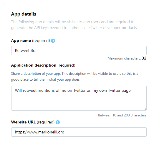 Cuando tenga permiso, haga clic en » Crear una aplicación(Crear aplicación) ”Otra vez y complete los detalles. Solo hay cuatro preguntas «obligatorias». Debe darle un nombre a su aplicación, explicar su propósito (dos veces) y proporcionar una dirección de sitio web. Puede completar el resto si lo desea, pero este no es necesariamente el caso.