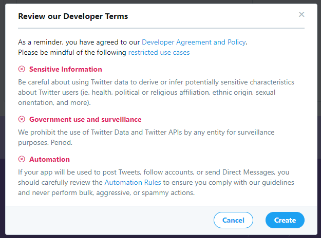 Haga clic en » Crear(Crear) «abajo y» Términos para desarrolladores(Términos del desarrollador) «.