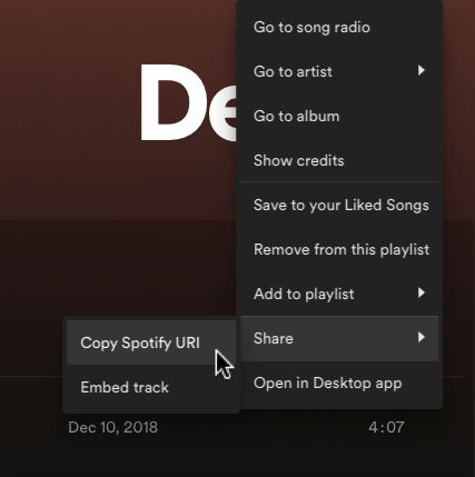 Mover el cursor a Para compartir(Comparar) y elige Copie la URI de Spotify(Copiar URI de Spotify) . Si no ve esta acción, mantenga presionada alternativa en ventanas o Tecla de opción activada Plumero para mostrarlo en un menú emergente.