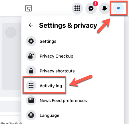 - Para comenzar, abra el sitio web de Facebook(open the Facebook website) e inicie sesión, luego seleccione el ícono de flecha hacia abajo en la parte superior derecha. (downwards arrow)En el menú emergente a continuación, seleccione Configuración y privacidad(Settings & privacy ) > Registro de actividad(Activity log) .