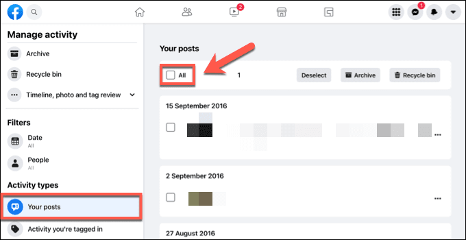- En el menú Administrar actividad(Manage Activity ) , asegúrese de que la opción Sus publicaciones esté seleccionada a la izquierda. (Your posts )Puede revisar cada publicación manualmente y seleccionar la casilla de verificación junto a cada publicación para seleccionarla para eliminarla o, alternativamente, seleccionar la casilla Todo(All ) para seleccionar todas las publicaciones de su perfil.