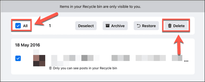 - Una vez que haya revisado y seleccionado las publicaciones, puede optar por archivarlas o eliminarlas. Archivarlas ocultará las publicaciones para que solo tú puedas verlas en el futuro, pero permanecerán en Facebook . Seleccione Archivar(Archive) para hacer esto, o presione Papelera de reciclaje(Recycle bin) para preparar las publicaciones para su eliminación.