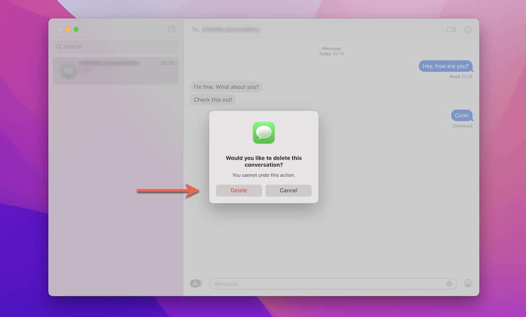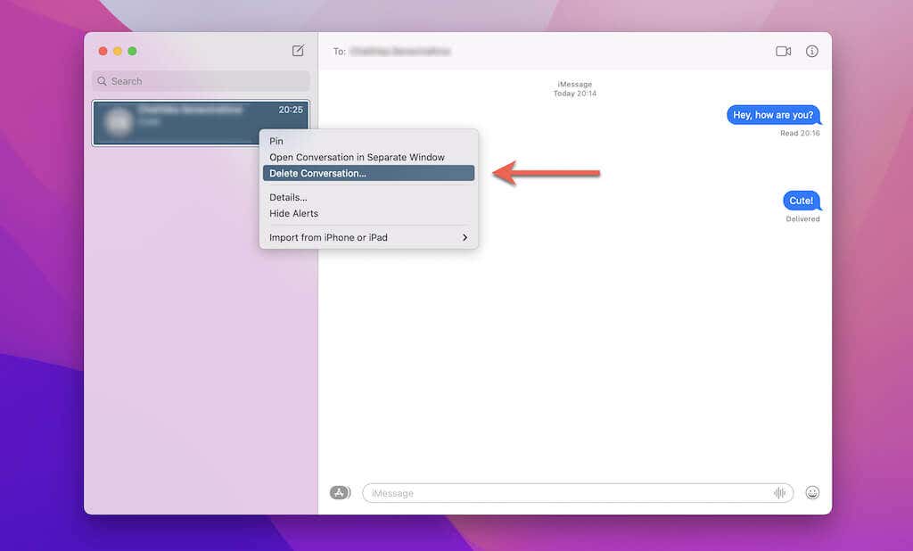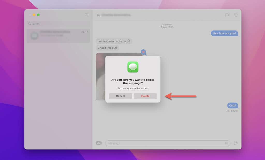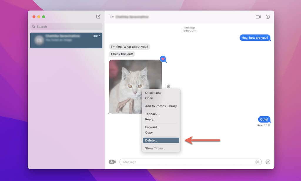 3. Haga clic con la tecla Control presionada o haga clic con el botón derecho en una burbuja de mensaje de texto o archivo adjunto dentro de la transcripción a la derecha. Luego, selecciona Eliminar(Delete) .