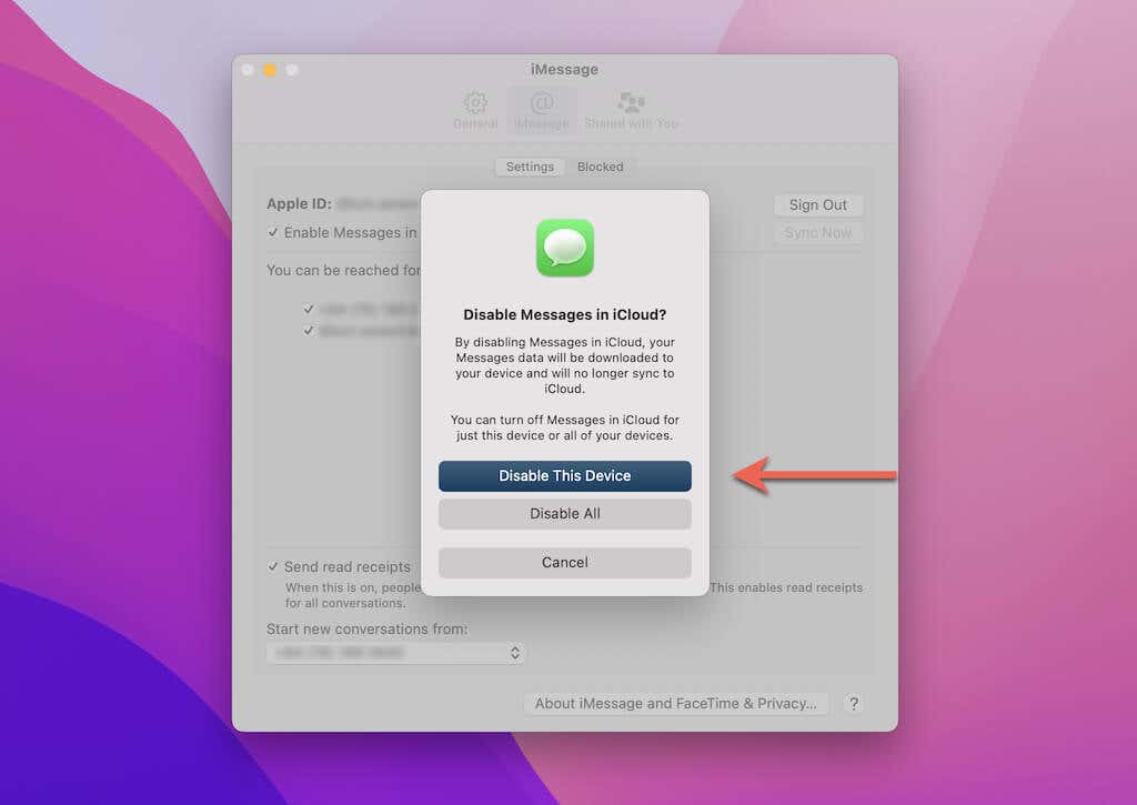 3. Seleccione Deshabilitar este dispositivo(Disable This Device) para desactivar Mensajes en iCloud para su Mac .